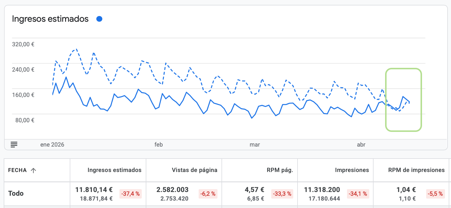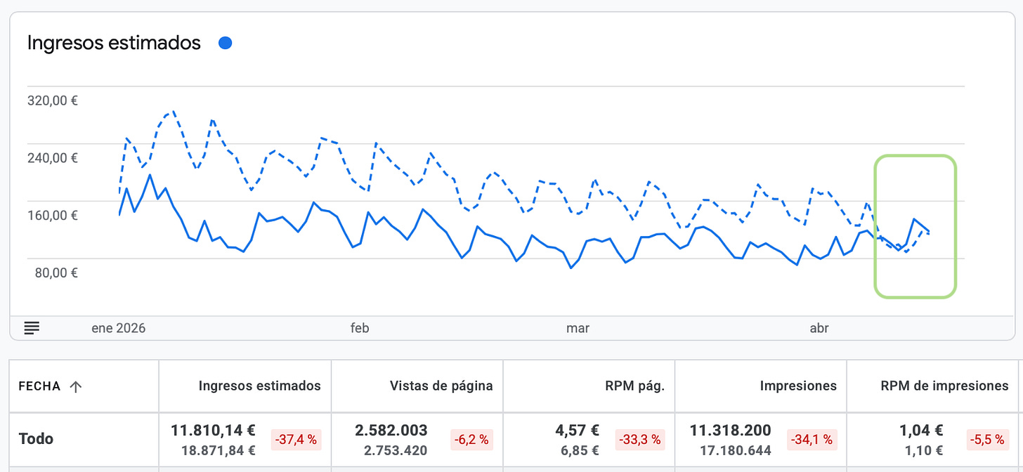 Llevaba desde 2024 viendo cómo Adsense se iba deshinchando y ya casi había normalizado eso de abrir el dashboard y ver un -40% respecto año anterior.
