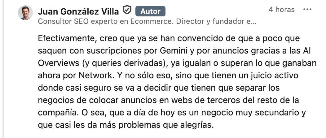 También entiendo que Google, como empresa, se pregunte por qué debería seguir enviando millones de visitas a páginas que han convertido las SERPs en un lodazal de contenido lleno de Ads, enlaces de afiliado y cero expertise.