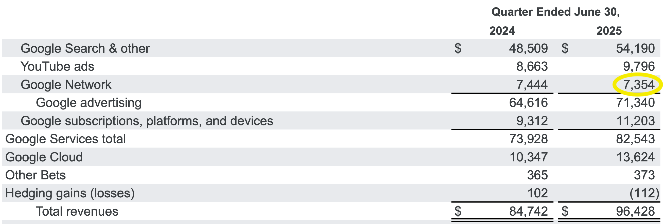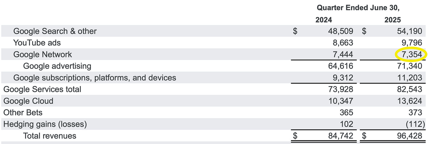 En mi opinión, a Google esto le da bastante igual. Según los datos publicados esta semana con los ingresos del Q2 de 2025, AdSense apenas representa un 7% de su facturación (es la partida de Google Network de la siguiente imagen, que incluye más cosas, pero por simplificar).