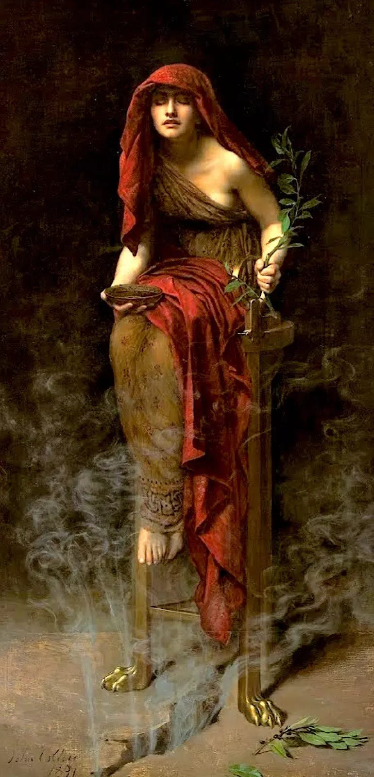 Ese lugar, custodiado por la serpiente Pitón hasta que Apolo la derrotó, acabó siendo mucho más que un punto geográfico. Delfos se convirtió en el nexo entre lo humano y lo divino. El canal de comunicación con los dioses era la Pitía: una sacerdotisa sentada en un trípode, en trance, rodeada de vapores que salían de una grieta, y que transmitía las palabras de Apolo a los mortales que buscaban consejo o predicciones.